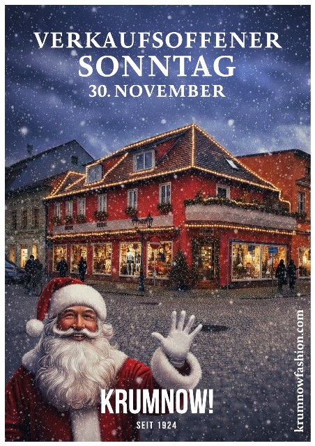 Die Händler der schönen Beeskower Innenstadt laden am 1. Advent zum verkaufsoffenen Sonntag ein. Freut euch auf verschiedene Aktionen in den Geschäften und entdeckt bei KRUMNOW! tolle Weihnachtsgeschenke und die Winter-Modetrends völlig entspannt bei einer Tasse Kaffee und leckerer selbstgebackener Stolle und in gewohnt angenehmer Atmosphäre. Wir öffnen von 12 Uhr bis 18 Uhr.
